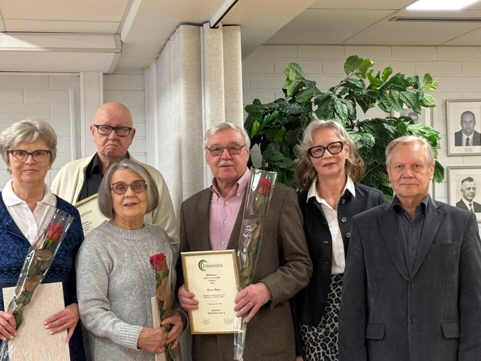 Kuvissa oikealla myös Eläkeliiton Humppilan yhdistyksen puheenjohtaja Marja-Liisa Haapala ja Eläkeliiton Etelä-Hämeen piirin puheenjohtaja Seppo Kaija.